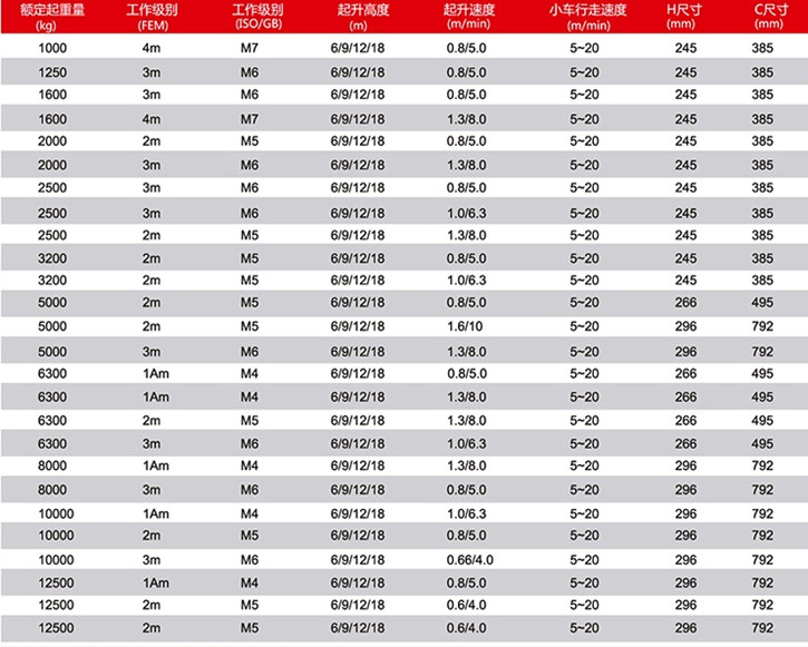 歐式鋼絲繩電動(dòng)葫蘆(單梁)參數(shù)表: